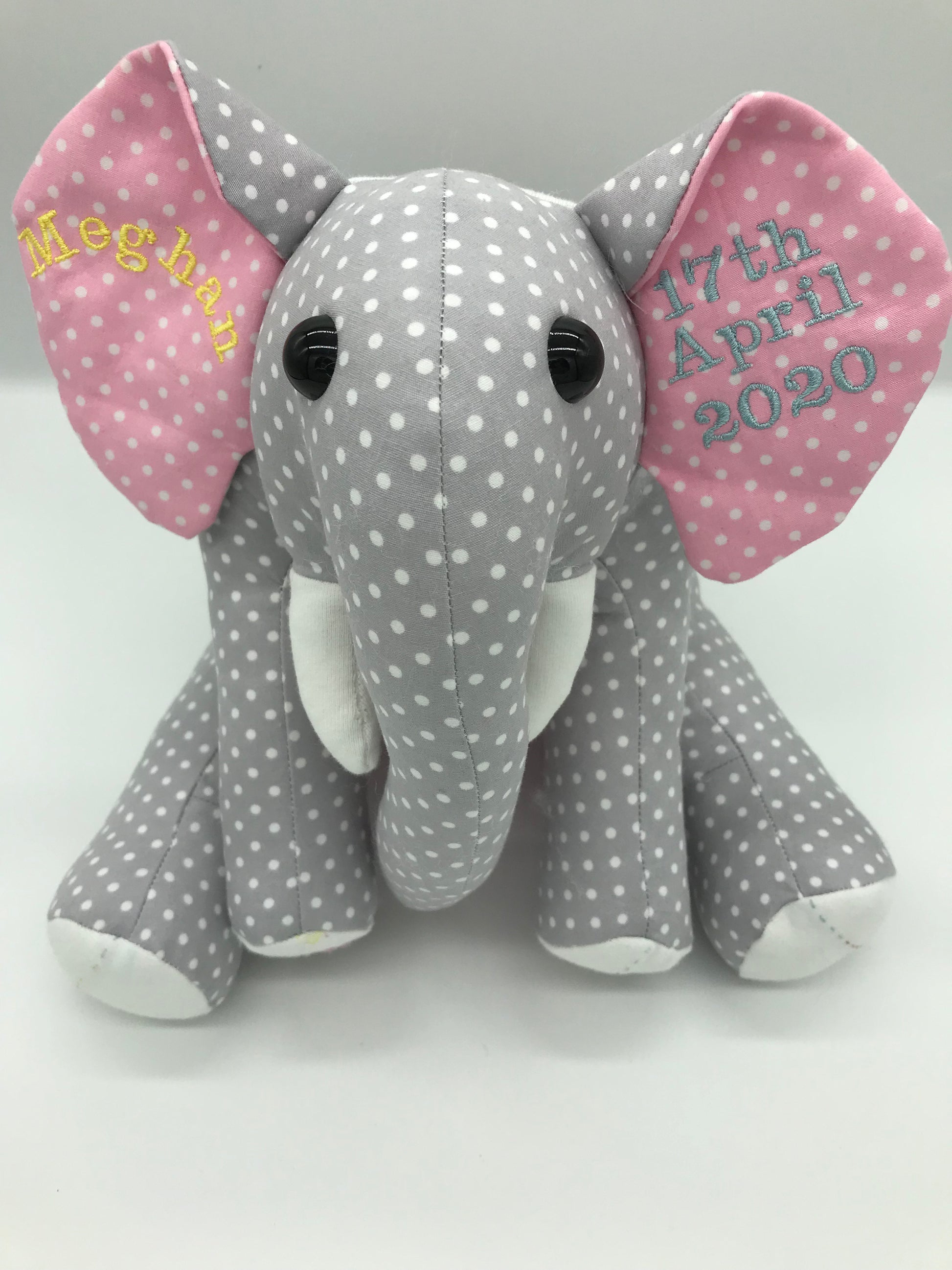 Thoughtfully handmade using Funky Friends Factory pattern for the sitting version and a Xanthe pattern for the standing version. These personalised memory elephants are a heartfelt way to preserve and display your most treasured memories.